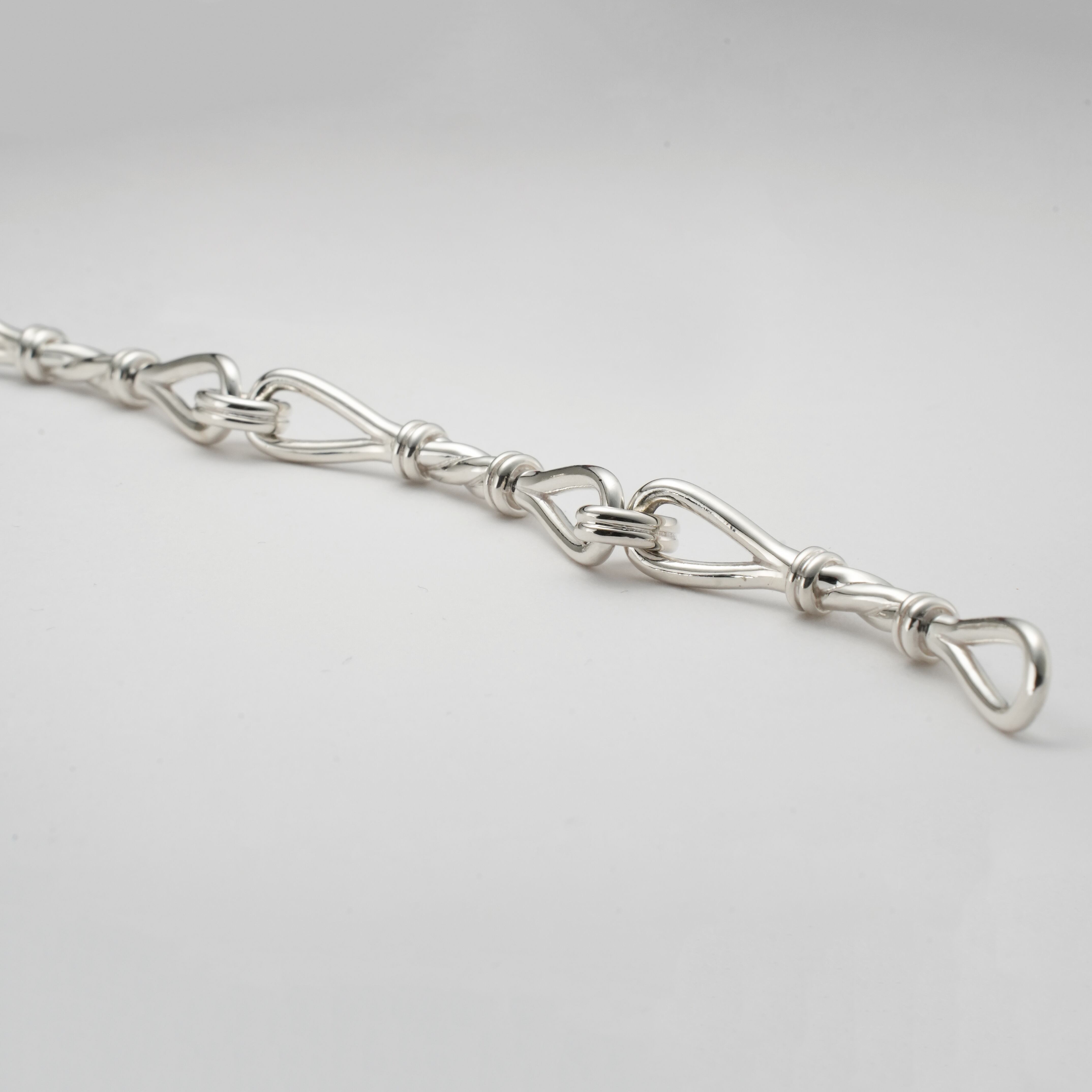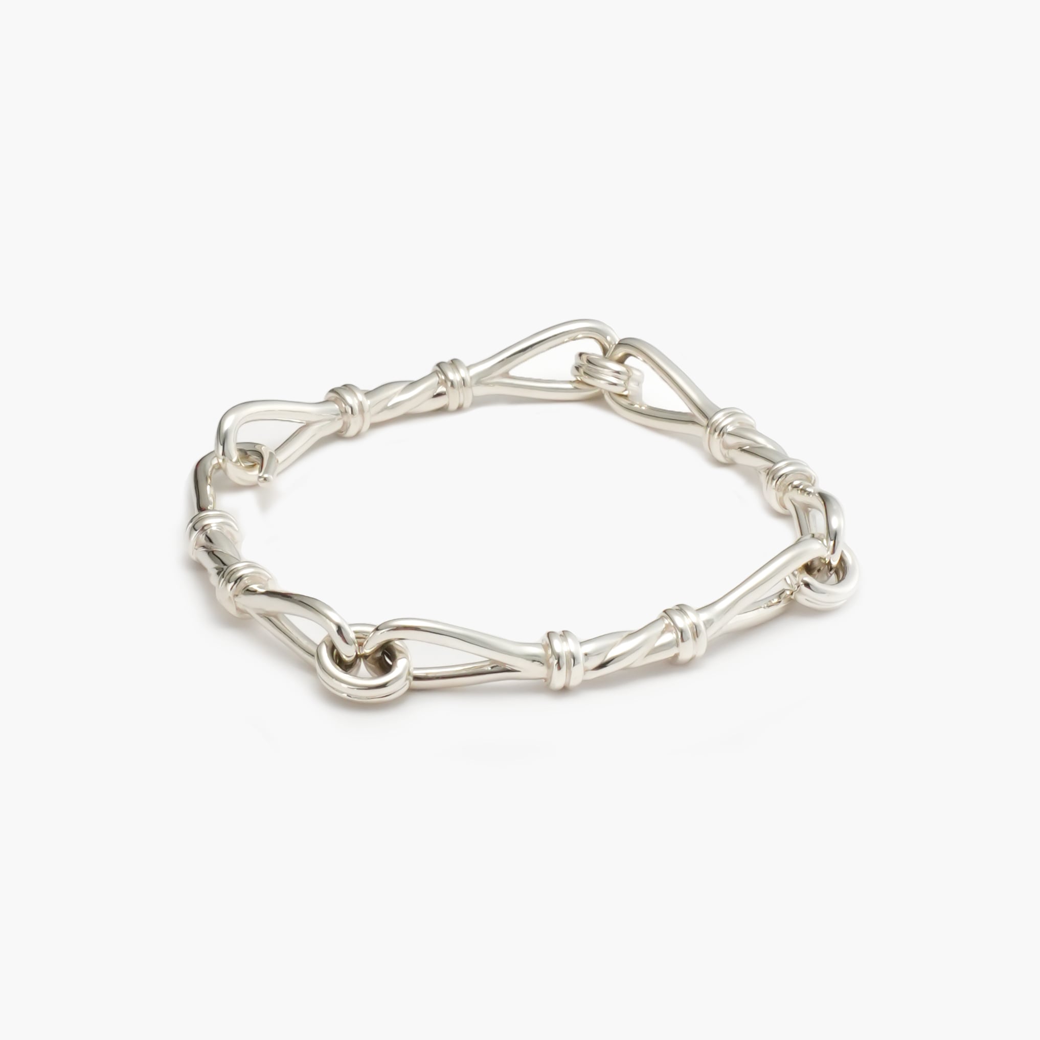 ねじりを加えたシルバーが連なり、結ばれた構造的なデザインが特徴のブレスレット。