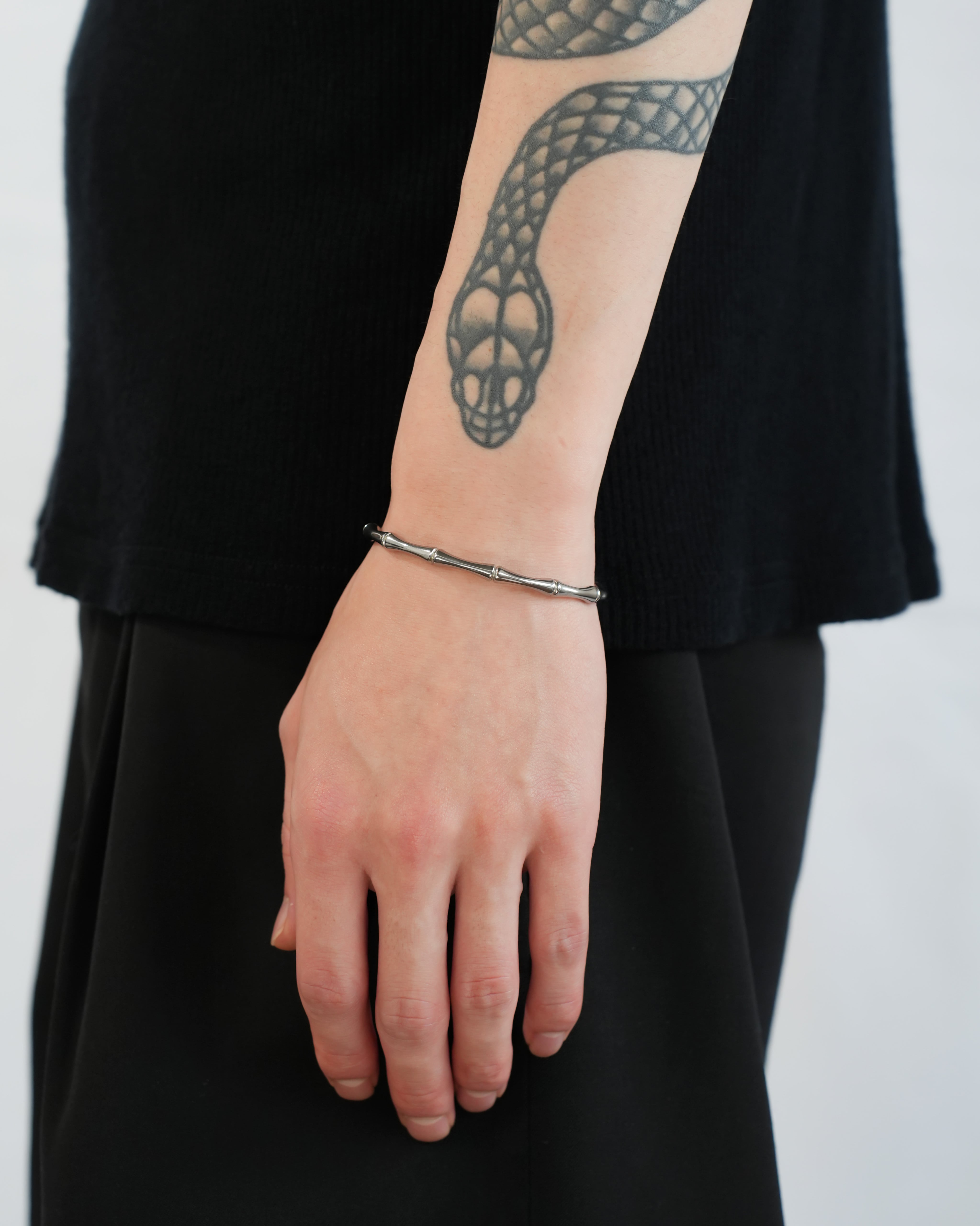 「骨で人と人を繋ぐ」というテーマで制作したこのバングルの表現は、骨は体の支えであり、